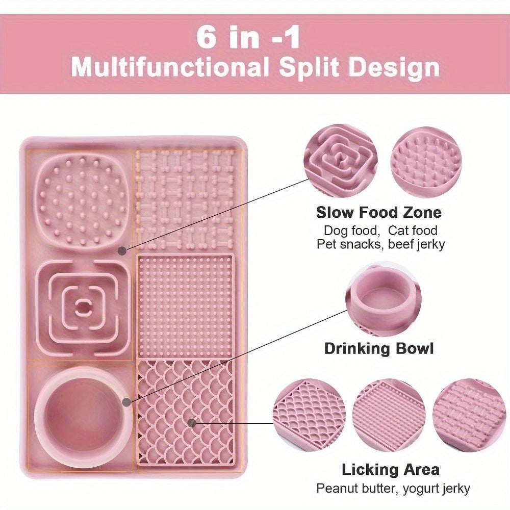 Este tapete es un oasis de calma en medio de la vida cotidiana. Con sus seis compartimentos y texturas diferentes, te permite esparcir alimentos húmedos o premios, desafiando a tu perro a lamer lentamente. Esta actividad, además de ser divertida, libera endorfinas que ayudan a reducir la ansiedad, el aburrimiento y comportamientos destructivos.