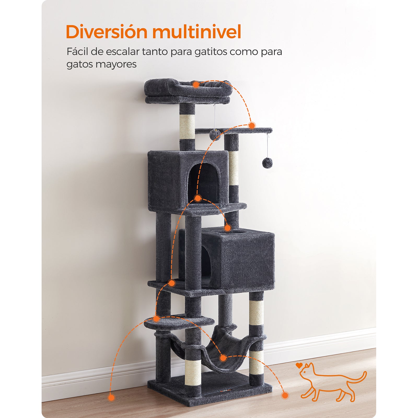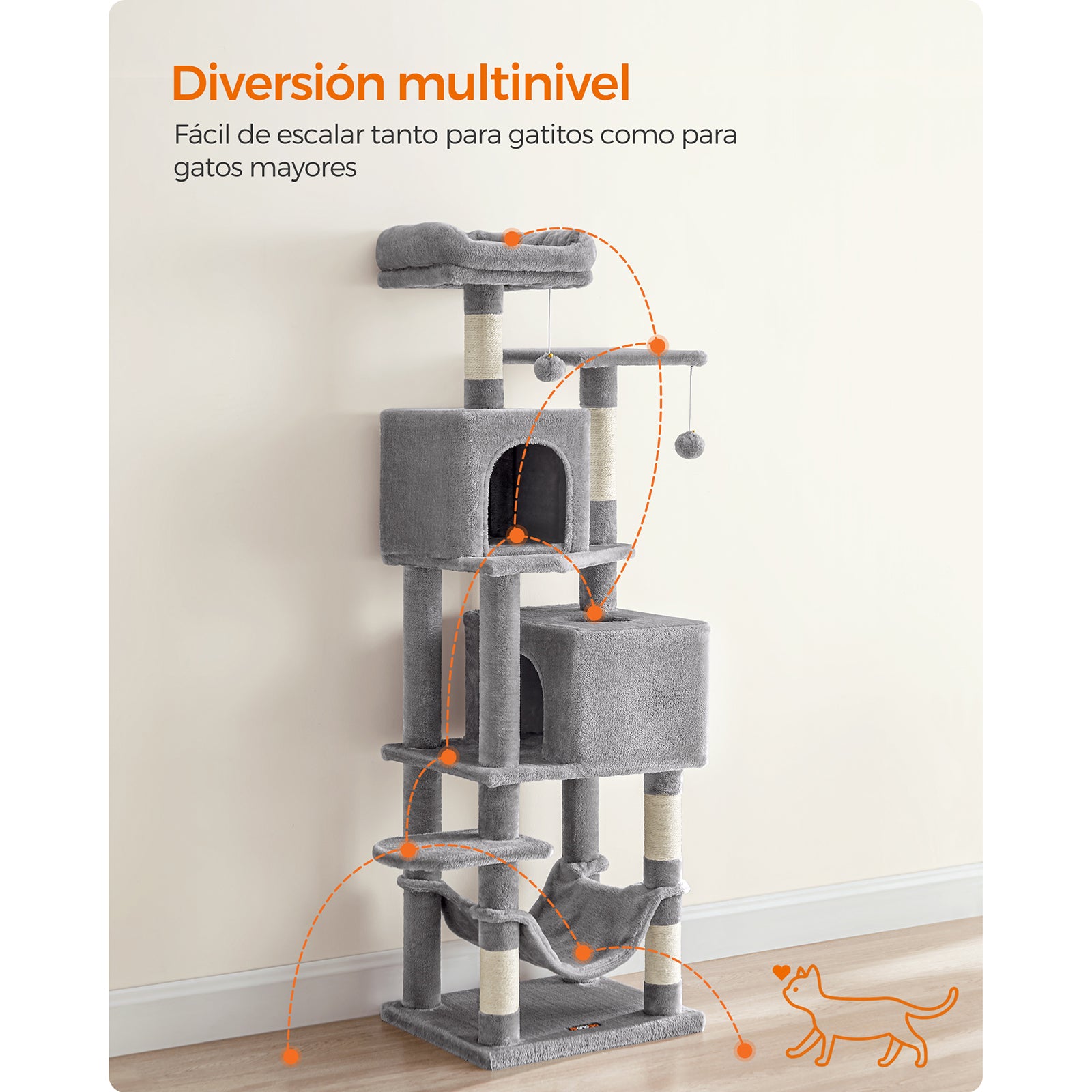 Este árbol de gatos es la solución ideal para hogares con varios felinos, ofreciendo una combinación perfecta de espacios para jugar y rincones para relajarse. Sus materiales de alta calidad y su diseño robusto garantizan horas interminables de entretenimiento sin comprometer la seguridad.